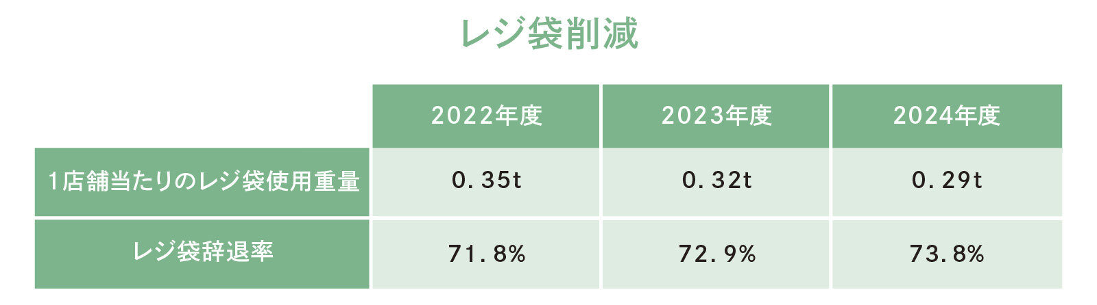 また、レジ袋のサイズの見直しや薄肉化を行い、ご利用状況に合わせて種類を集約することに努めています。さらに、レジ袋は環境に配慮したバイオマス素材30%配合環境配慮型を推奨。2025年にはその配合率を50%に引き上げた製品を導入し、2030年までにプラスチック製レジ袋の使用量をゼロにすることを目標としています。