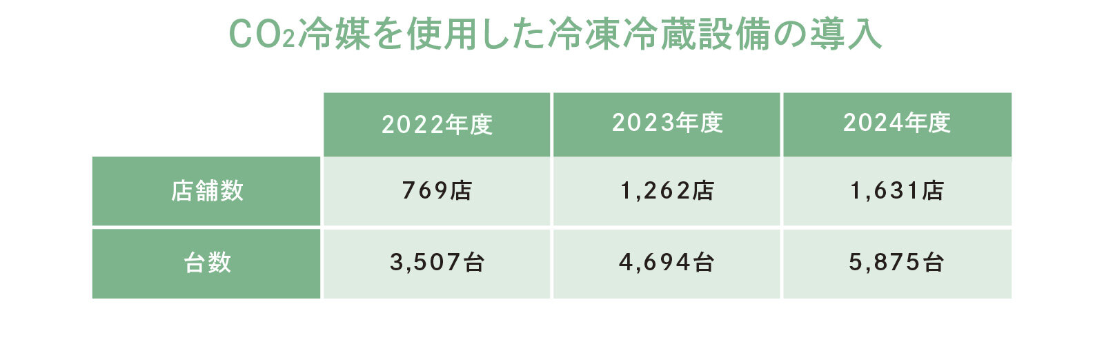 代替フロン中のHCFC(ハイドロクロロフルオロカーボン)は2020年までに先進国で生産が全廃され、他の種類への切り替えといった対応が必要となります。そのため、セブン‐イレブン・ジャパンでは、店舗で使用している商品陳列用の冷凍冷蔵ケースのノンフロン化を進めており、2025年2月末時点で1,631店舗へCO2冷媒を使用した冷凍冷蔵設備を導入しています。