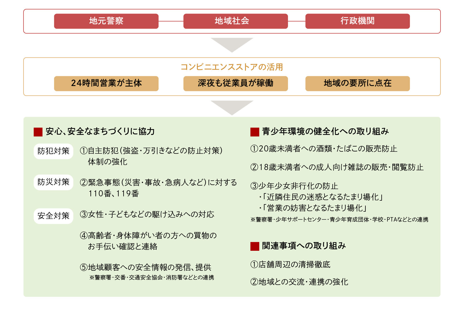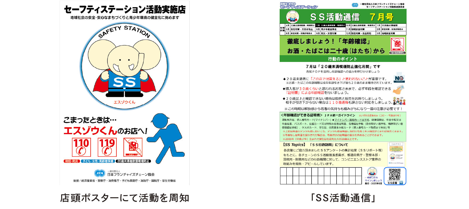 セブン‐イレブン・ジャパンでは、多くの店舗が年中無休、24時間営業という特性を活かして、女性・子どもの駆け込みや高齢者保護、強盗・万引き・特殊詐欺被害の防止、災害や事故、急病人への対応など、安全・安心を見守る地域の拠点として「セーフティステーション活動」(SS活動)に取り組んでいます。また、20歳未満者にお酒・たばこを販売しないなど、青少年を取り巻く環境の健全化に努めるとともに、毎月発行している「SS活動通信」を通して、加盟店のコンプライアンス意識や防犯意識を高める情報発信をしています。