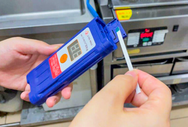 店舗では、酸価値(AV)をAVチェック読取機で測定し、油の品質を管理しています。