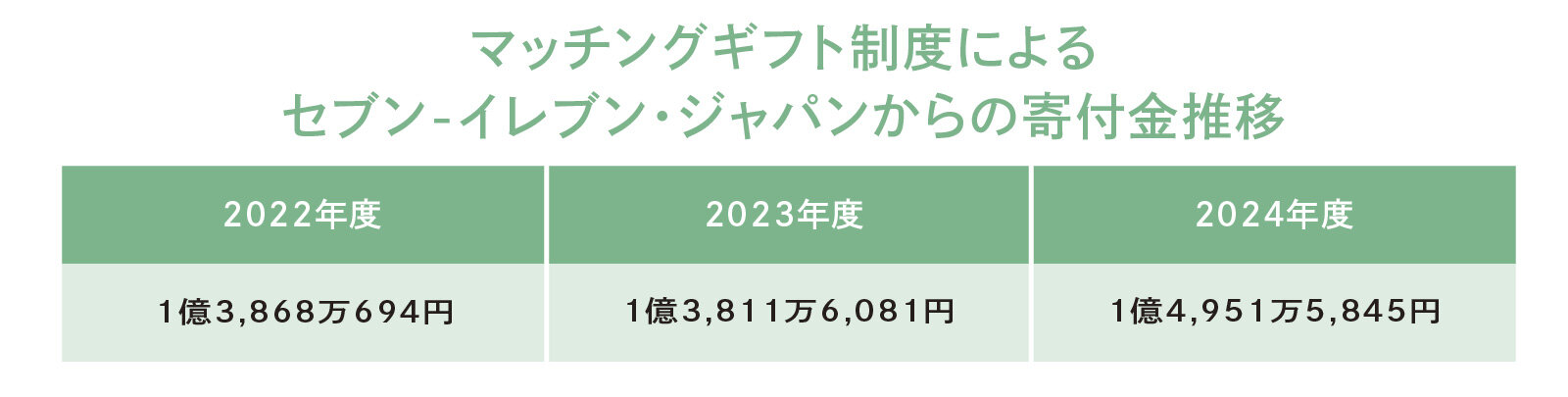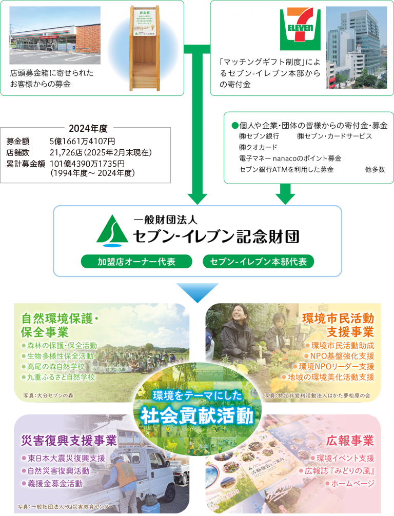 一般財団法人セブン‐イレブン記念財団は、全国のセブン-イレブン店頭に寄せられたお客様からの募金とマッチングギフト制度によるセブン-イレブン・ジャパンからの寄付金を主な財源に活動しています。 このほか、個人・団体・企業からの寄付金や、店頭募金以外の募金もいただいています。