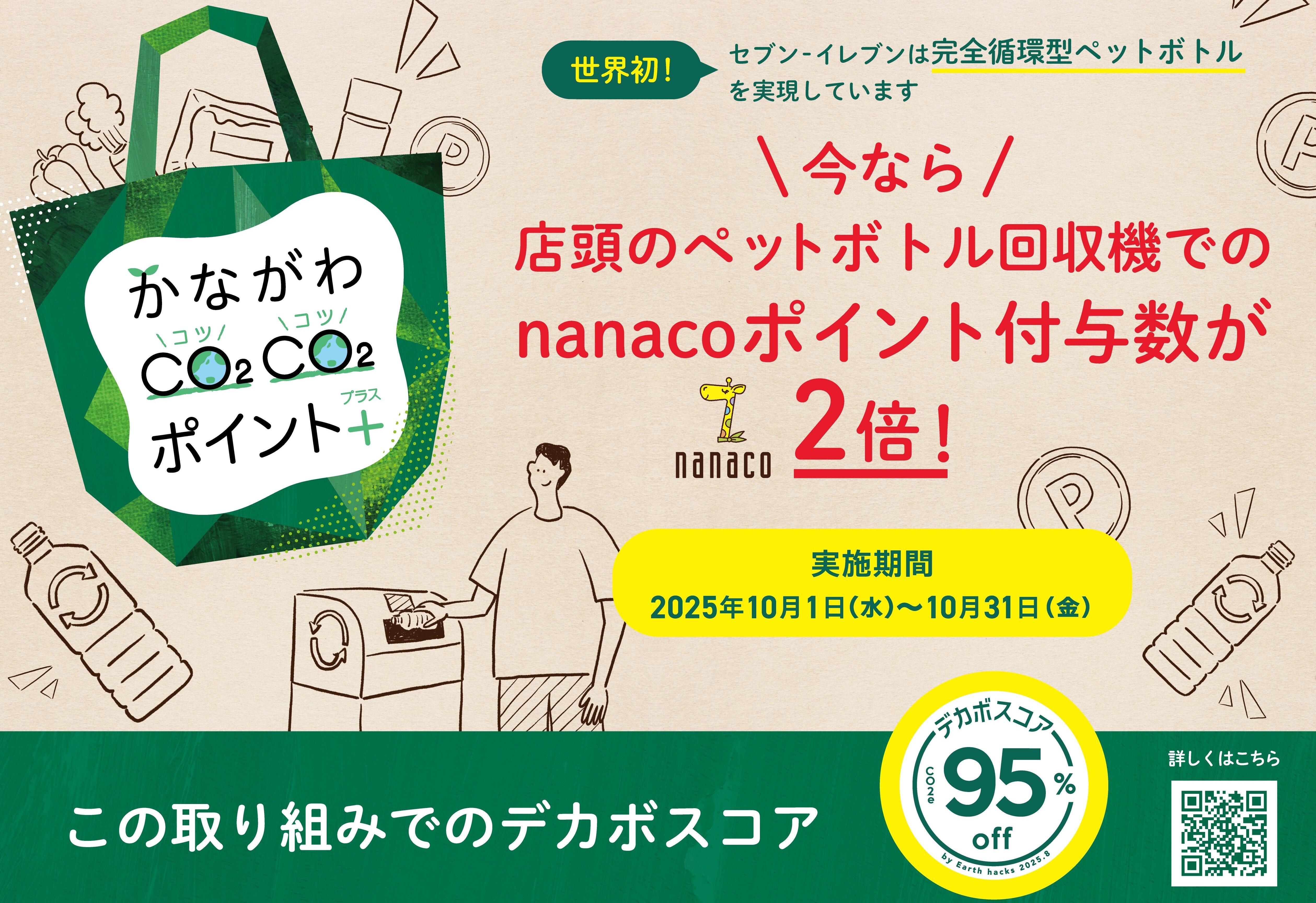 株式会社セブン‐イレブン・ジャパン(以下、セブン‐イレブン)は、神奈川県が推進する脱炭素アクション「かながわCO2CO2(コツコツ)ポイント+」キャンペーンに参加し、県内の環境課題解決に向けた取り組みを強化します。 ペットボトル回収機の利用を県民の皆さまに広く周知することで、「ごみを資源へと変える」という意識の醸成や、リサイクル活動の一層の推進を目指します。