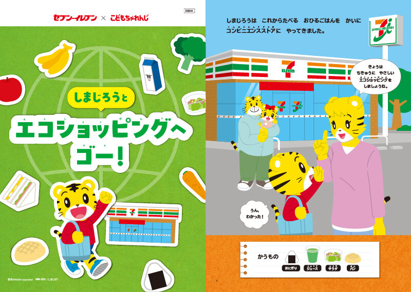 セブン‐イレブンで実践できるエコなお買い物のヒントを紹介する「セブン‐イレブンでできるエコショッピング」の冊子です。しまじろうと一緒にクイズに答えながら、日々のお買い物の中で環境にやさしい選択ができるようなアイデアを学べるので、お買い物中に親子で「エコ」について会話するきっかけにつながります。