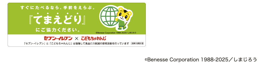 このたび、ベネッセの「こどもちゃれんじ」とセブン‐イレブン・ジャパンは連携し、10月より期間限定で、「しまじろう」デザインの「エコだ値」シールと「てまえどり」POPをセブン‐イレブン店舗にて展開します。