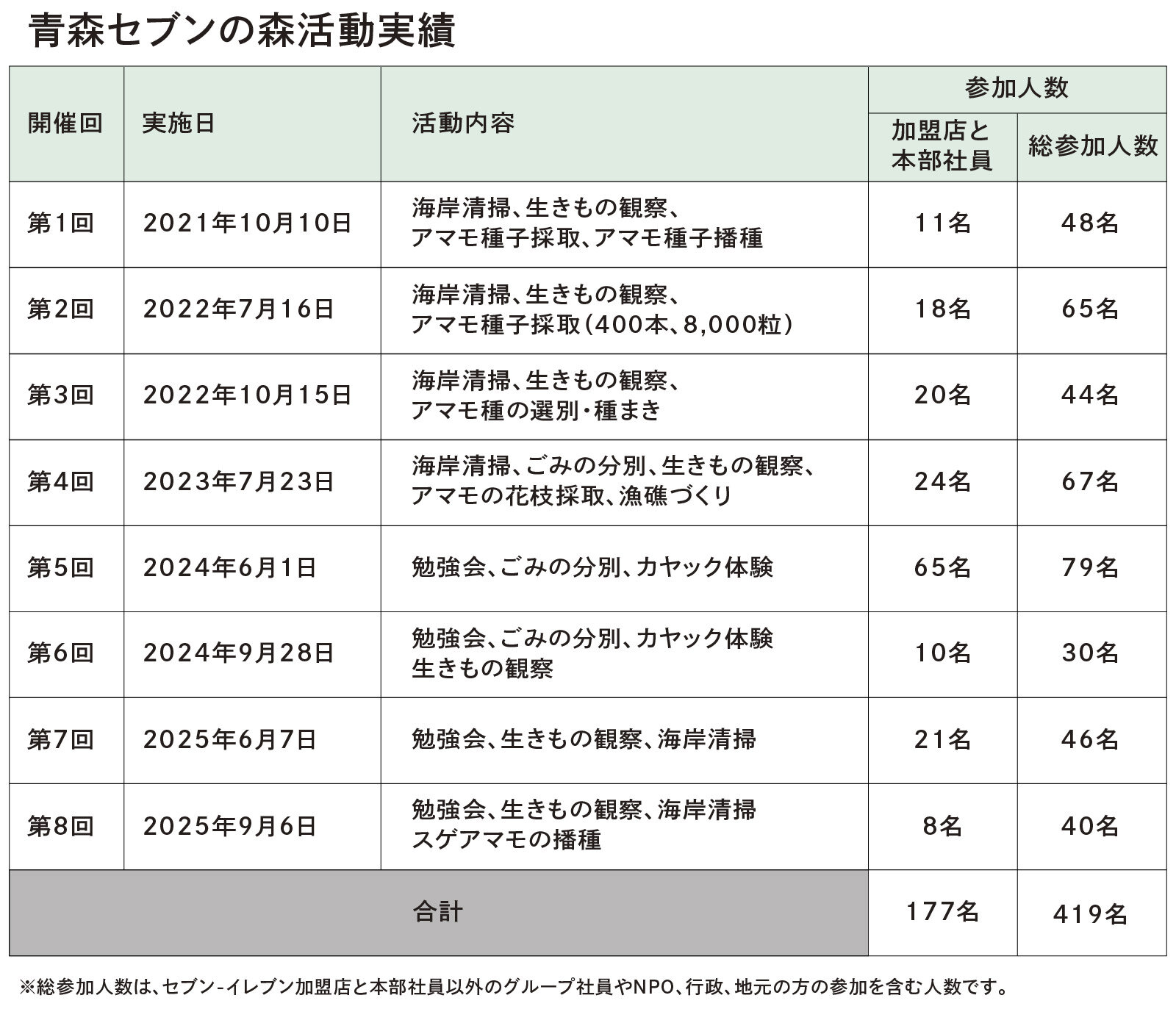 セブン-イレブン記念財団は、豊かな自然環境の再生やCO₂の削減を目指し、「セブンの森・セブンの海の森」づくり活動を進めています。 今回は9月6日に行われた「青森セブンの海の森」の活動をご紹介します。