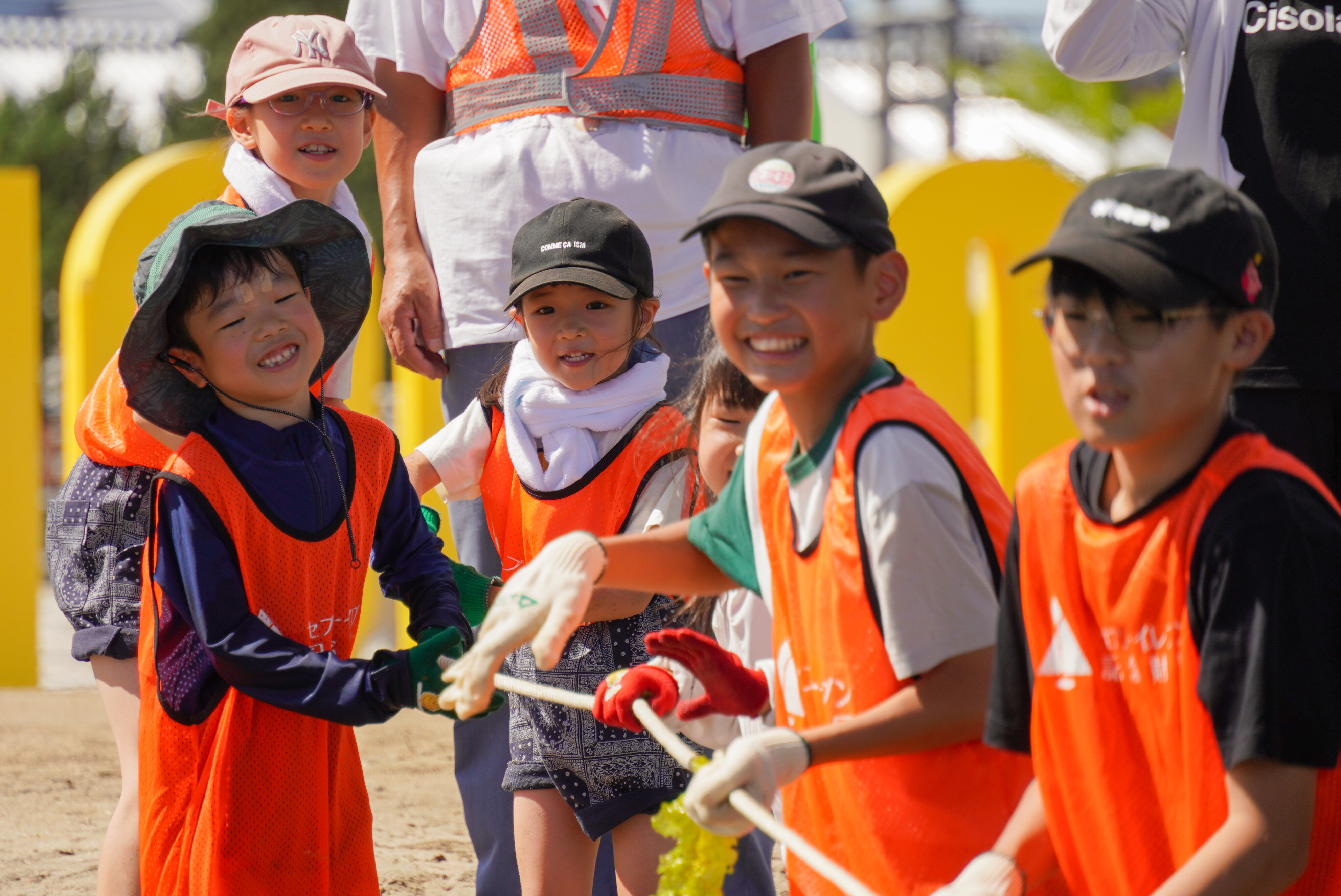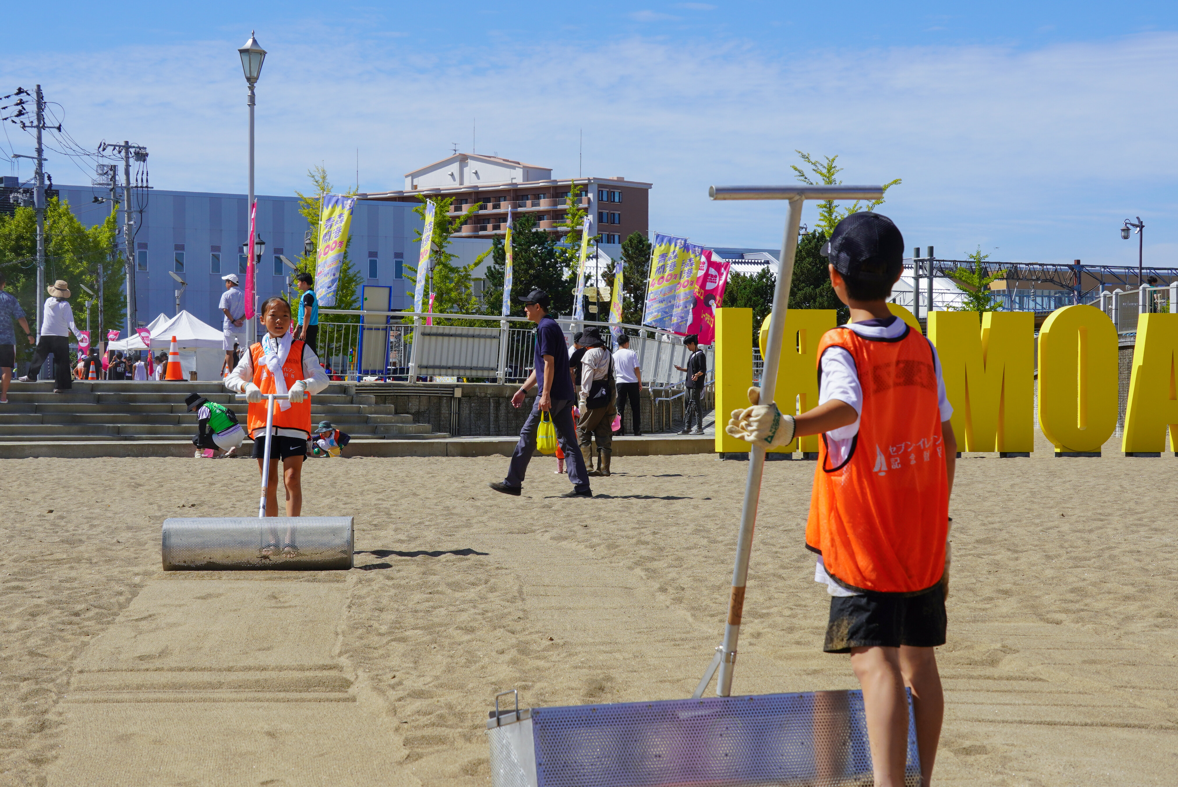 座学では、海洋ゴミやアマモについて学び、活動の意義や目的を理解したうえで、実際の体験活動に取り組みました。 座学の後は、レーキを使って砂浜の小石を除去し、浜に打ち上げられたゴミなどを清掃しました。レーキで小石を取り除くにはコツが必要で、表面の砂を薄くすくわないとレーキが重くなり、うまく扱えません。 子どもたちは最初こそ苦戦していましたが、徐々に慣れて上手に作業を進めていました。