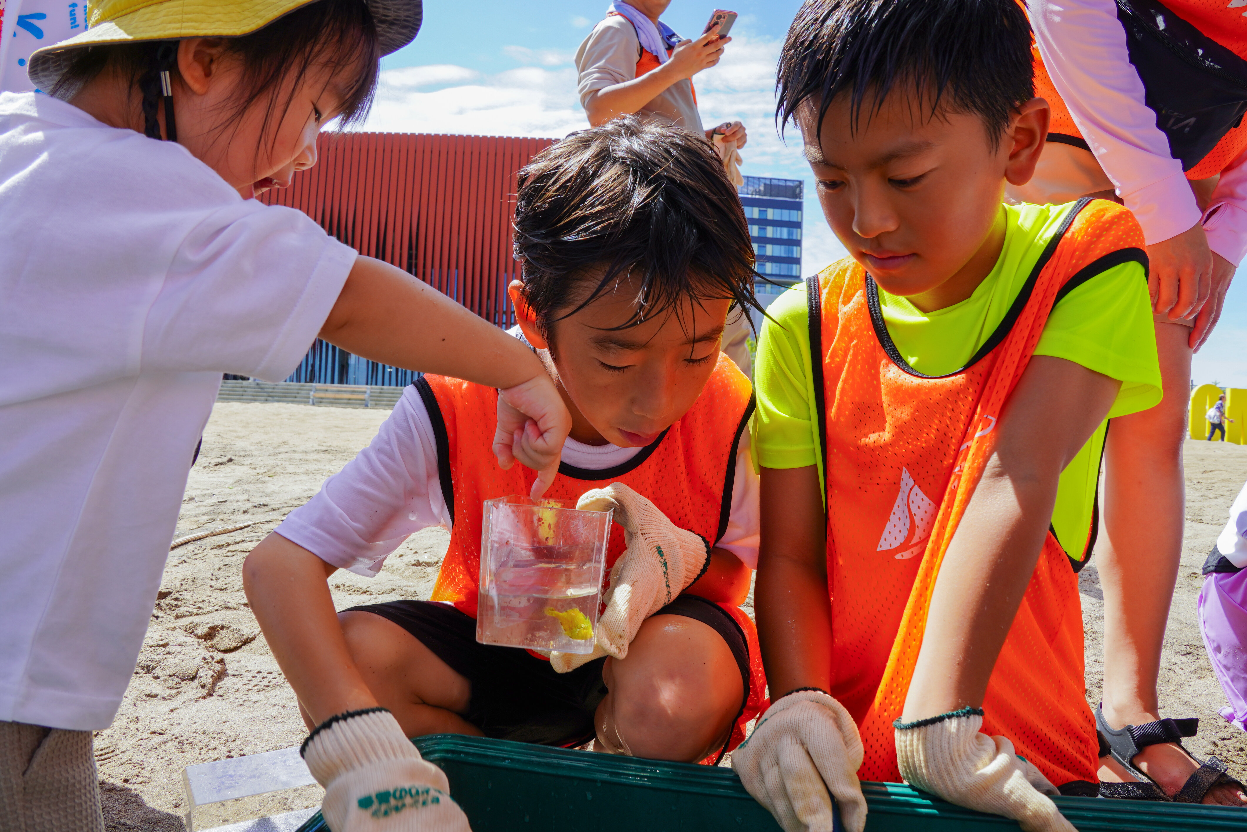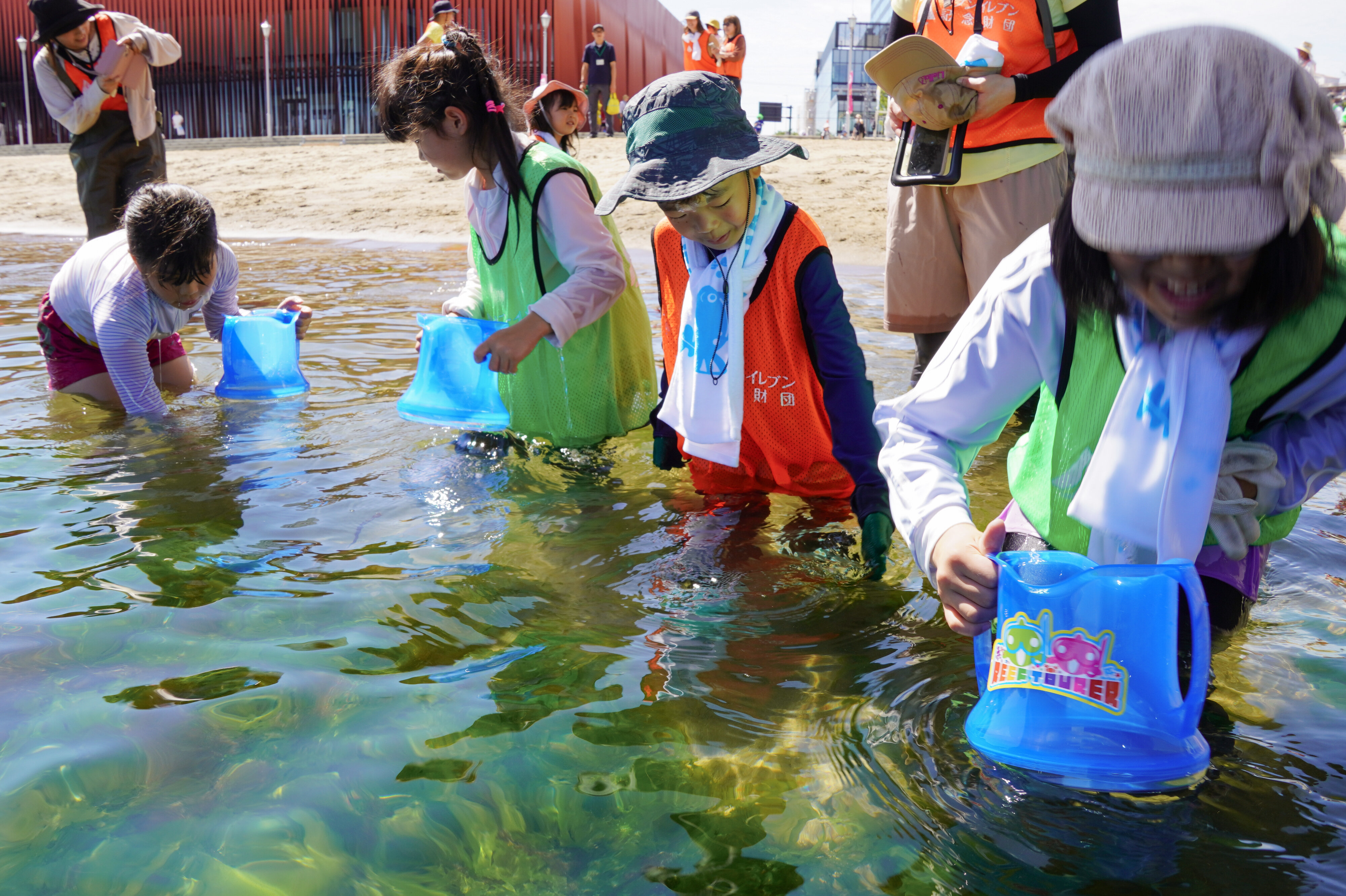 その後は、あおもり駅前ビーチに棲む生きものの観察を行いました。まず水中スコープを使って魚を探し、ハゼやオコゼ、フグなどを観察しました。続いて、地引網を使った生きもの調査を実施。参加者全員で掛け声を合わせながら網を引き、浅瀬に生息する生きものを確認しました。子どもたちは網にかかった生きものを探して水槽に入れ、観察を楽しみました。あおもりみなとクラブの志田様による解説もあり、大人も子どもたちも興味津々で観察していました。