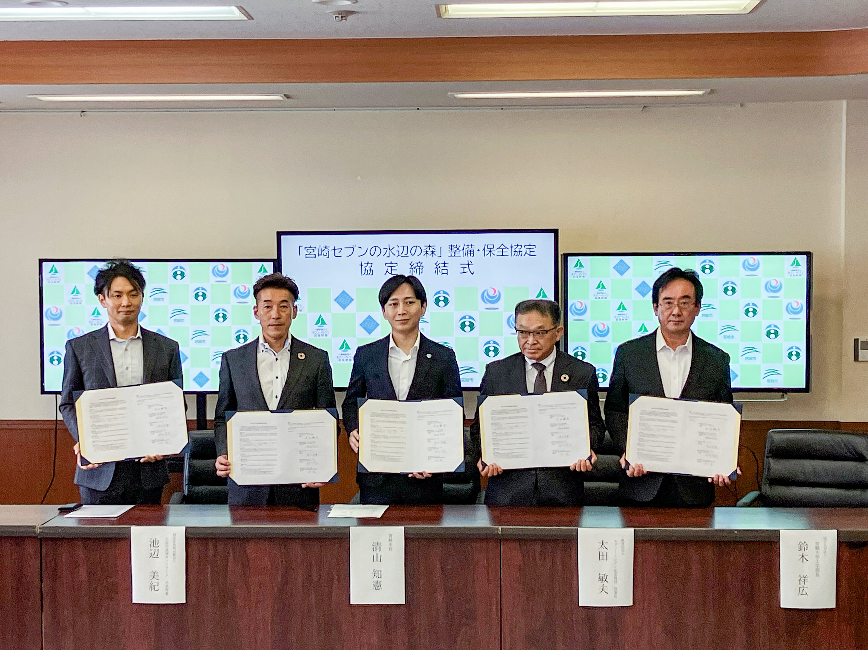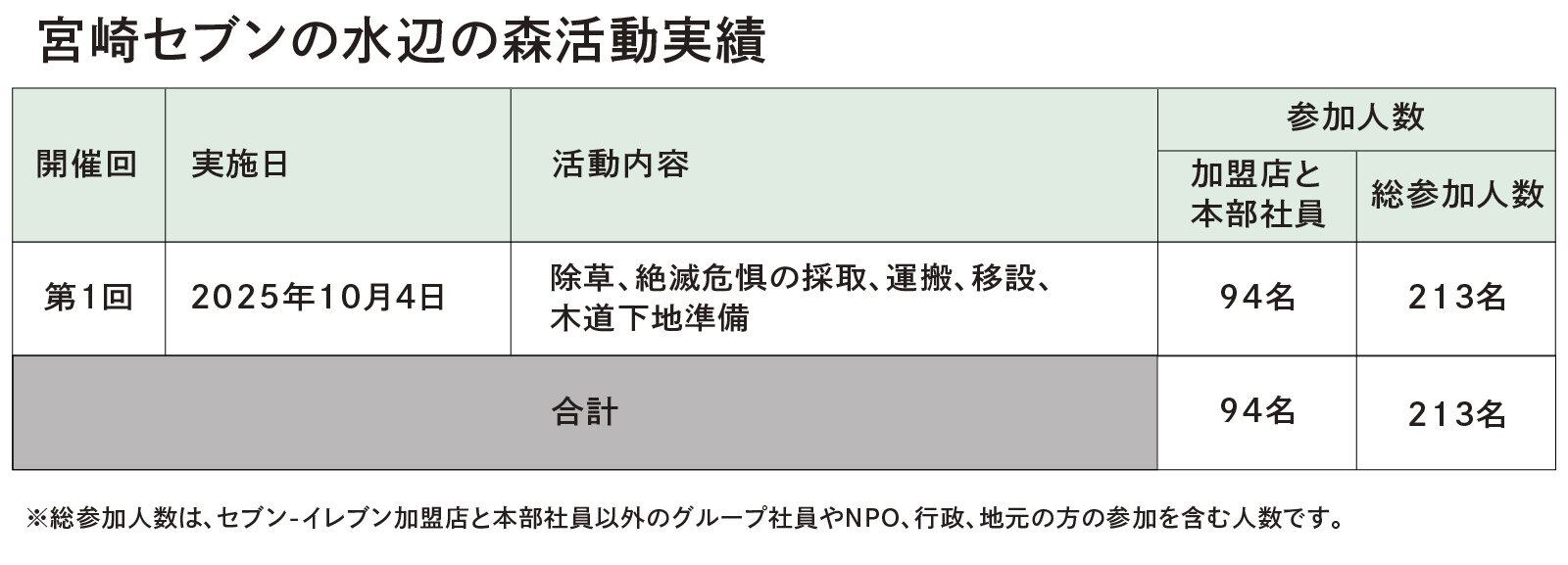 このたび、「宮崎セブンの水辺の森」整備活動がスタートしました。第1回目となる今回の活動には、総勢213名の方々にご参加いただきました。