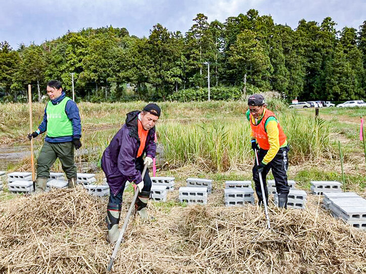 作業は二人一組になり、麻ひもを使って束ねていきます。湿地特有のぬかるんだ足場に苦労しながらも、各チームが協力して背の高い「ぼっち」をいくつも完成させました。山形大学の学生や子どもたちも積極的に参加し、笑顔と活気にあふれる現場となりました。