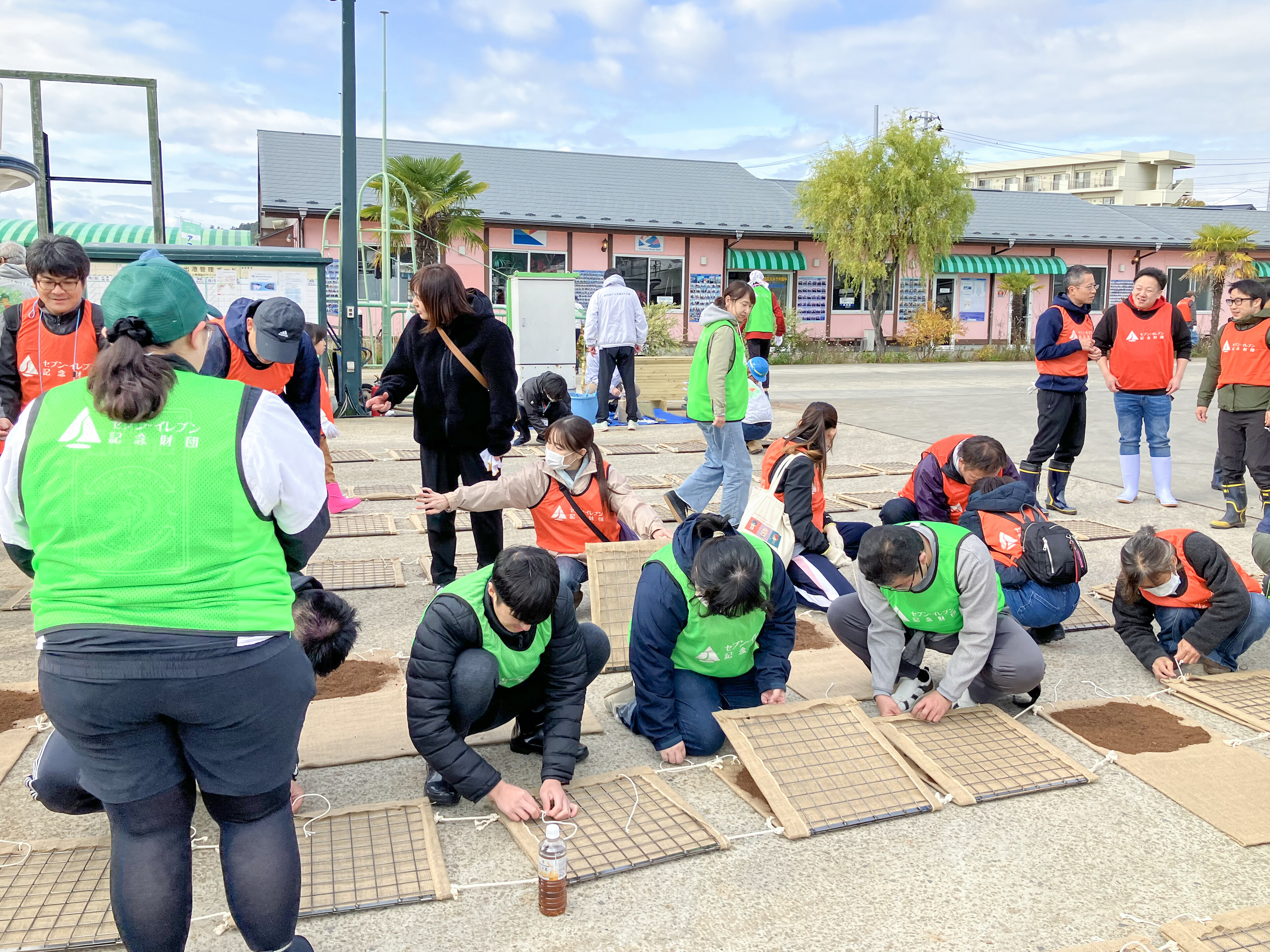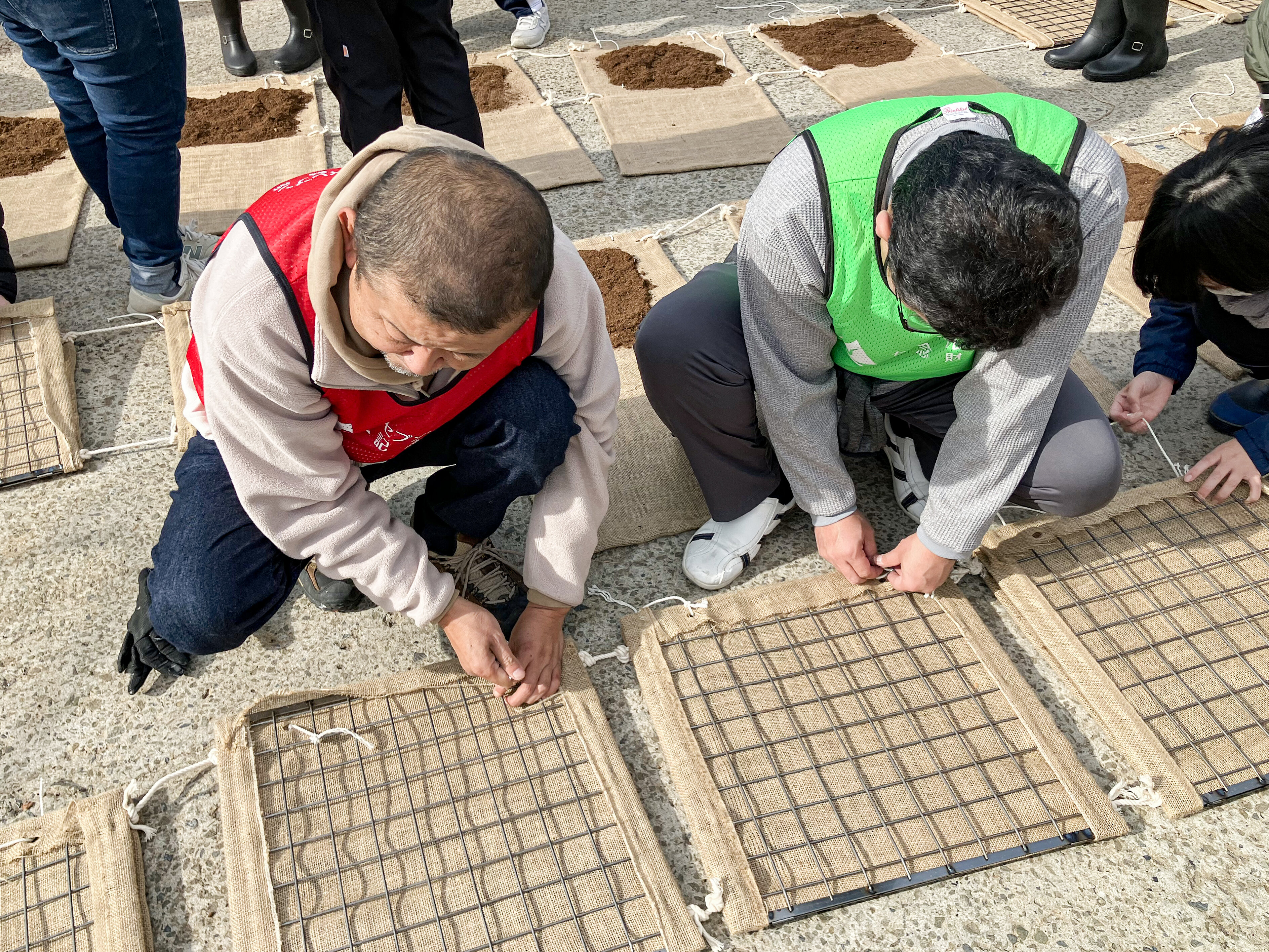 さらに、天然繊維を使った専用のゾステラマットに種と腐葉土を挟み込み、麻ひもでしっかり結んで完成させる作業も行いました。参加者同士が声を掛け合いながら協力し、短時間で効率よく進めることができました。
