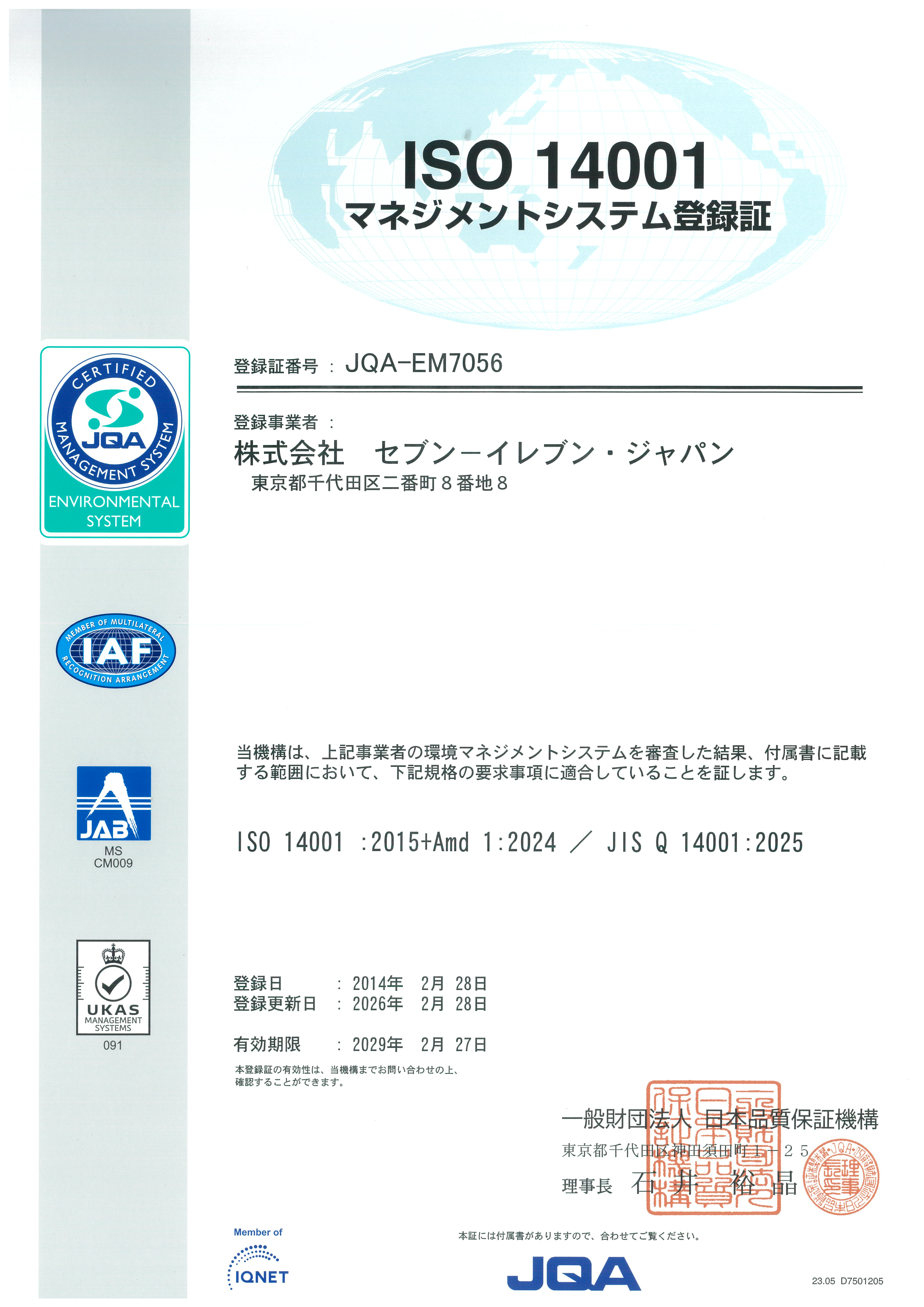セブン‐イレブン・ジャパン(以下、当社)は、2026年1月に国際規格「ISO14001」に基づく環境マネジメントシステム(EMS)の3年次更新審査を受審し、引き続き認証登録が承認されました。