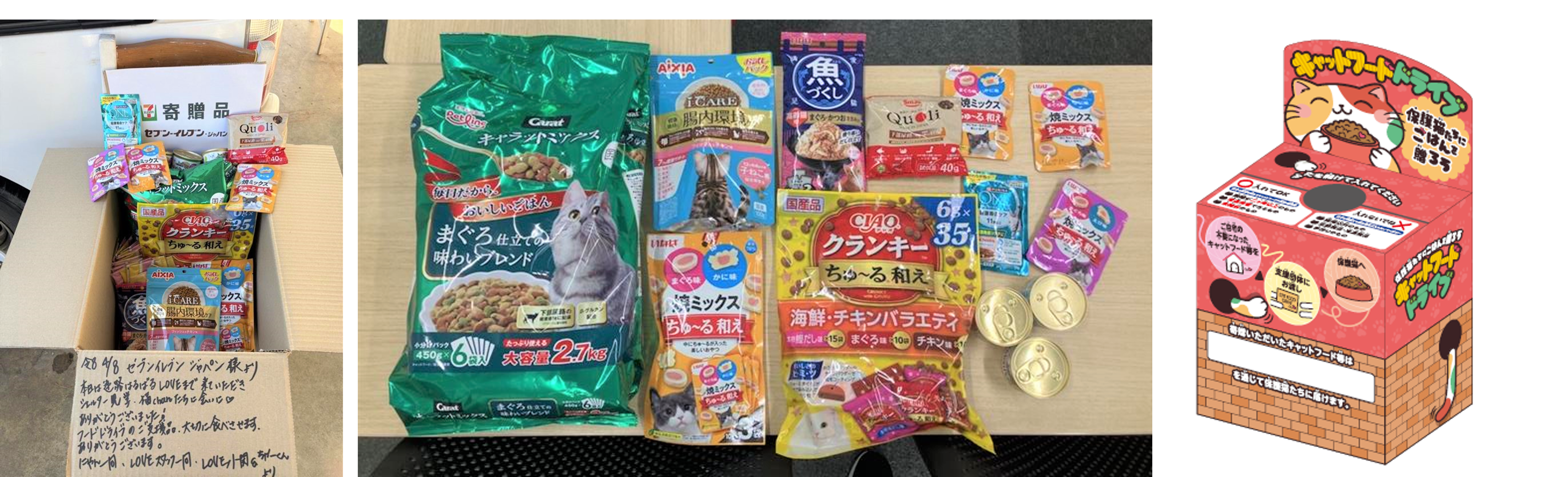 その一環として、猫の日に合わせてセブン‐イレブン松戸常盤平駅前店で開始した「キャットフードドライブ活動」では、ご家庭で未使用のキャットフード等を店舗で回収し、支援団体を通じて保護猫活動に役立てていただく取り組みを実施しています。